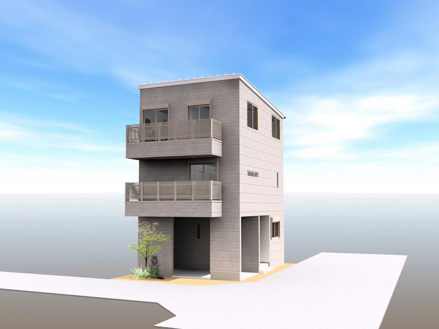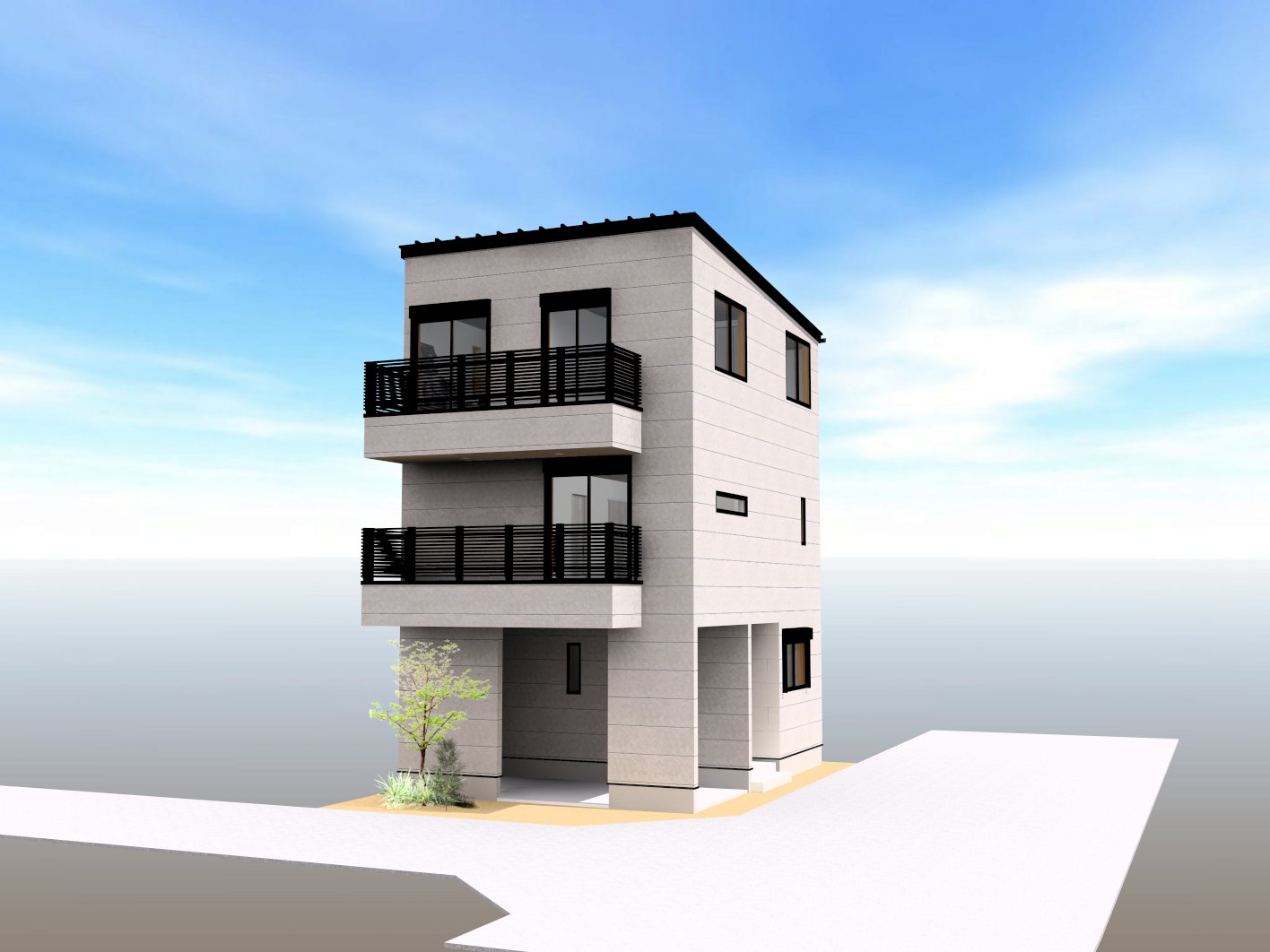 三方が道路に面しているため、玄関やカースペースの配置、窓の設計など、